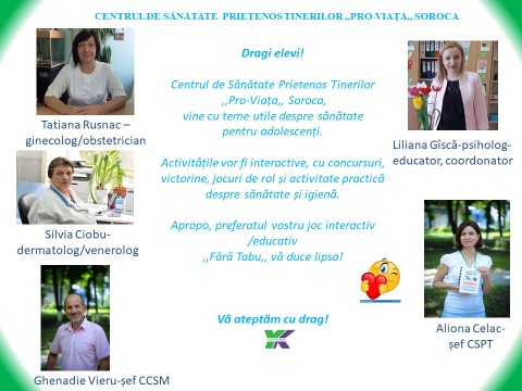 În cadrul acestei activități vor fi organizate 5 ateliere de lucru cu elevii-solicitanți din orașul și raionul Soroca, iar atelierul de SĂNĂTATE ȘI IGIENĂ, unde s-au inscris 38 de adolescenți, va fi moderat de specialiști din cadrul IMSP CS Soroca, CSPT ,,Pro-Viața,, și se va desfășura cu prezență fizică și on-line.