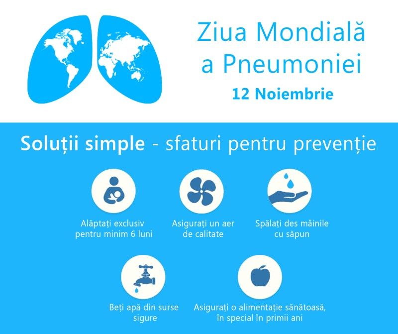 Pe 12 noiembrie este marcată Ziua Mondială a Pneumoniei.Anul 2020 marchează această zi în condiție de Pandemie de covid-19,fapt ce a cauzat o creștere dramatică a deceselor condiționate de pneumonie.